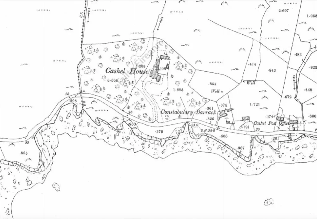 Geoffrey Emerson, who is said to have designed it for Captain Thomas Hazell, built Cashel House; a house with asymmetrical gabled elevations, in 1840, Geoffrey Emerson is a great, great grandfather of the present owners. The Hazells’ were English Landowners and were also agents for a Scottish firm buying kelp – a type of seaweed. The old Kelp stone still stands on the pier opposite Doon House. Captain Hazell and his Wife celebrated their 40th Wedding Anniversary at Cashel House in 1885. The Rose Hedge outside the Bar is said to be his present to her on that occasion. Mrs Hazell laid out a lot of the Gardens and planted many of the Flowering trees and Shrubs that you see today.